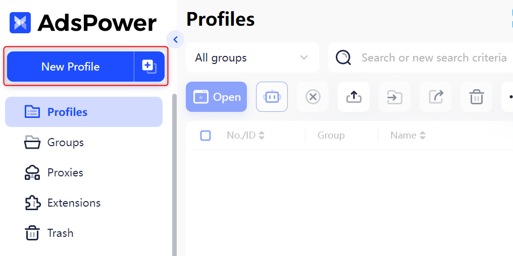 Open AdsPower and click the New Profile button to create a new browser profile.