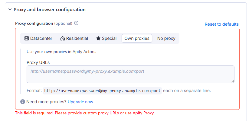 1. Scroll down to the Proxy and Browser Configuration section.2. Select Own proxies to enable custom proxy settings.3. Log in to your Oculus Dashboard.4. Click Show Configured List under the Generic tab to copy your proxy details.5. Paste the proxy information into the Proxy URLs field in Apify.