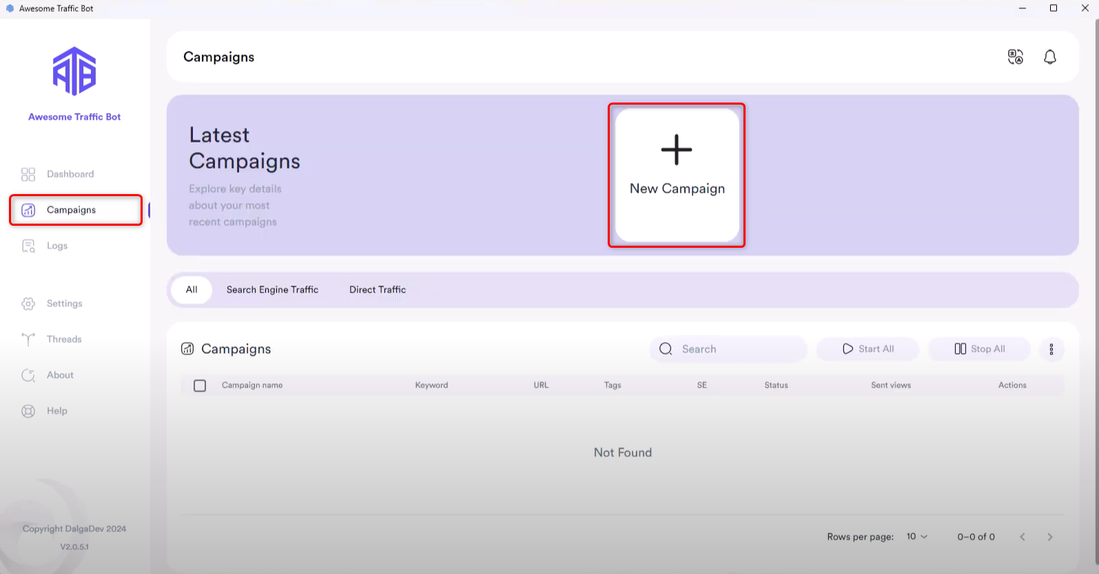 Open the app, navigate to the Campaigns section, and click New Campaign.