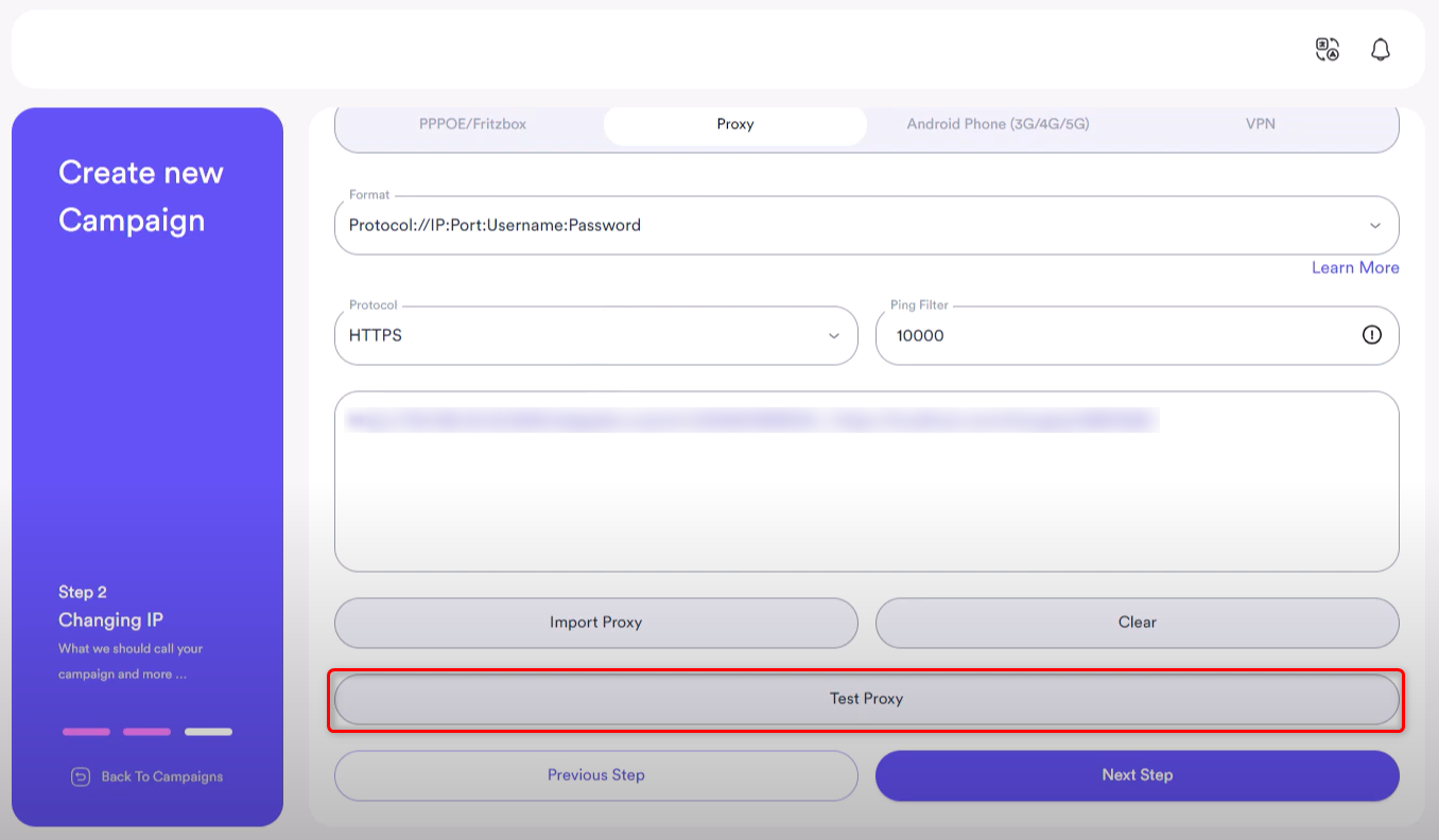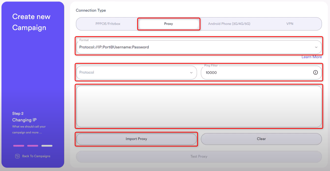 - Once you’ve given your campaign a name, choose Proxy as the connection method.