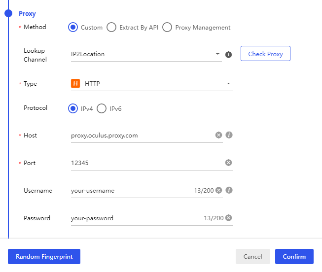 1. Scroll down to the Proxy section in the profile settings.2. Enter your Oculus Proxy details: