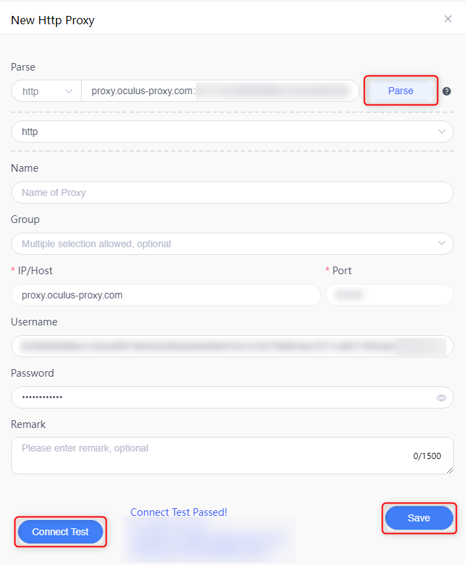 1. Log in to your Oculus Dashboard.2. Click Show Configured List under the Generic tab to copy your proxy details.3. Paste the proxy information into the required field in ClonBrowser.4. Click Parse.5. Click Connect Test to verify the connection.6. If successful, click Save to apply the settings.