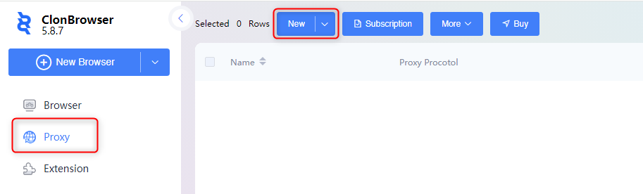 1. Navigate to the Proxy tab in the profile management section.2. Click New to create a new browser profile.