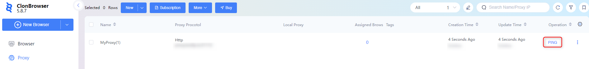 1. Return to the Proxy tab and locate the newly configured profile.2. Click Ping to ensure the proxy is active and functioning correctly.
