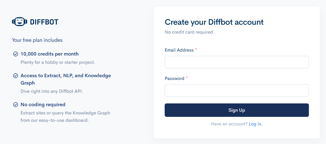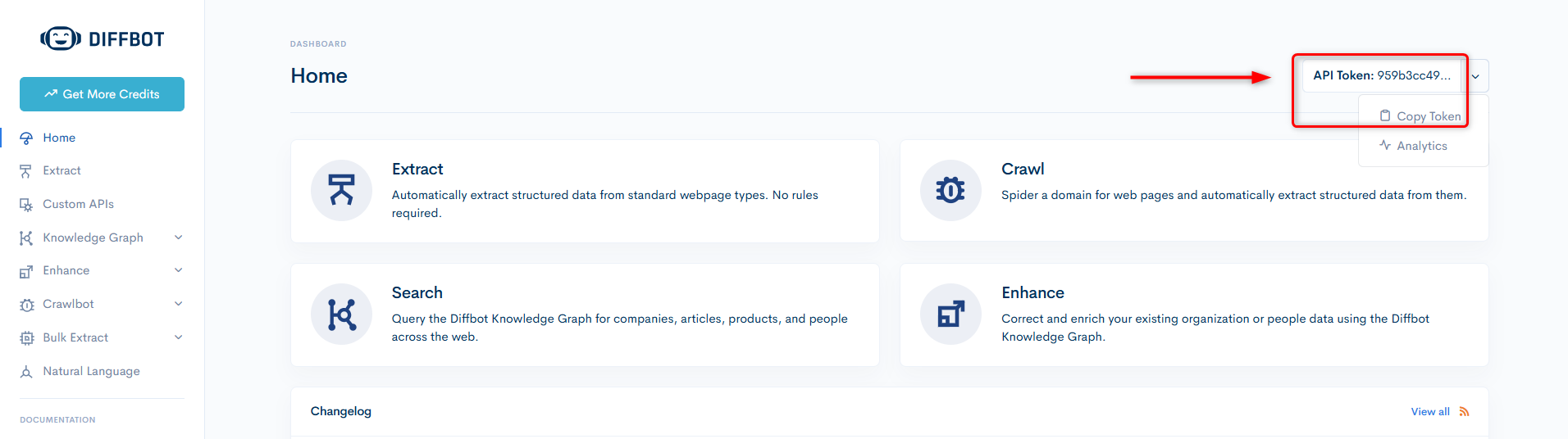 Visit Diffbot and register for a free account. Then, retrieve your API key from the top-right corner of the dashboard.
