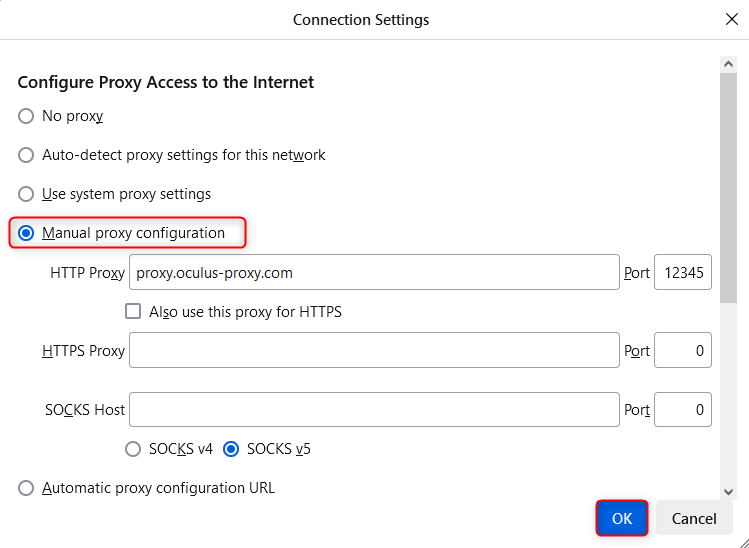 1. In the proxy settings window, select Manual proxy configuration.2. Enter your Oculus Proxy details: