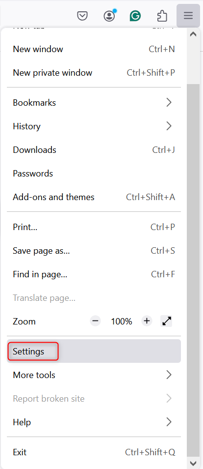 1. Launch Firefox.2. Click the menu icon (three horizontal lines) in the top-right corner.3. Select Settings from the dropdown menu.