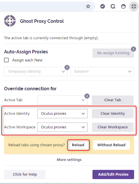 1. Go back to the Ghost Proxy Control menu.2. Under Active Identity or Active Workspace, select the Oculus proxy you just added.3. Reload your browser tabs to apply the proxy settings.