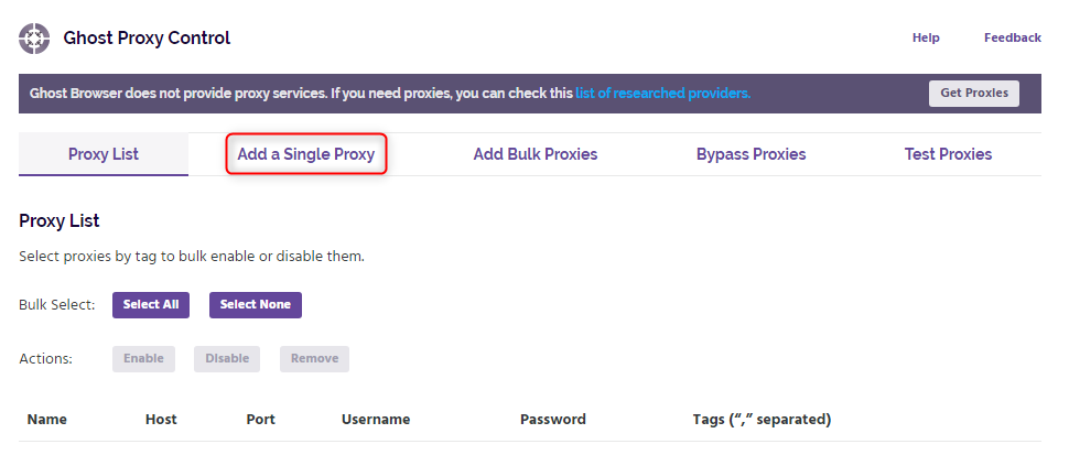 1. Click the Ghost Proxy Control icon in the top-right corner of the browser.2. Select Add/Edit Proxies from the dropdown menu.