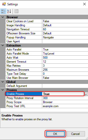 2. In the settings window, find the Enable Proxies option and set it to True.