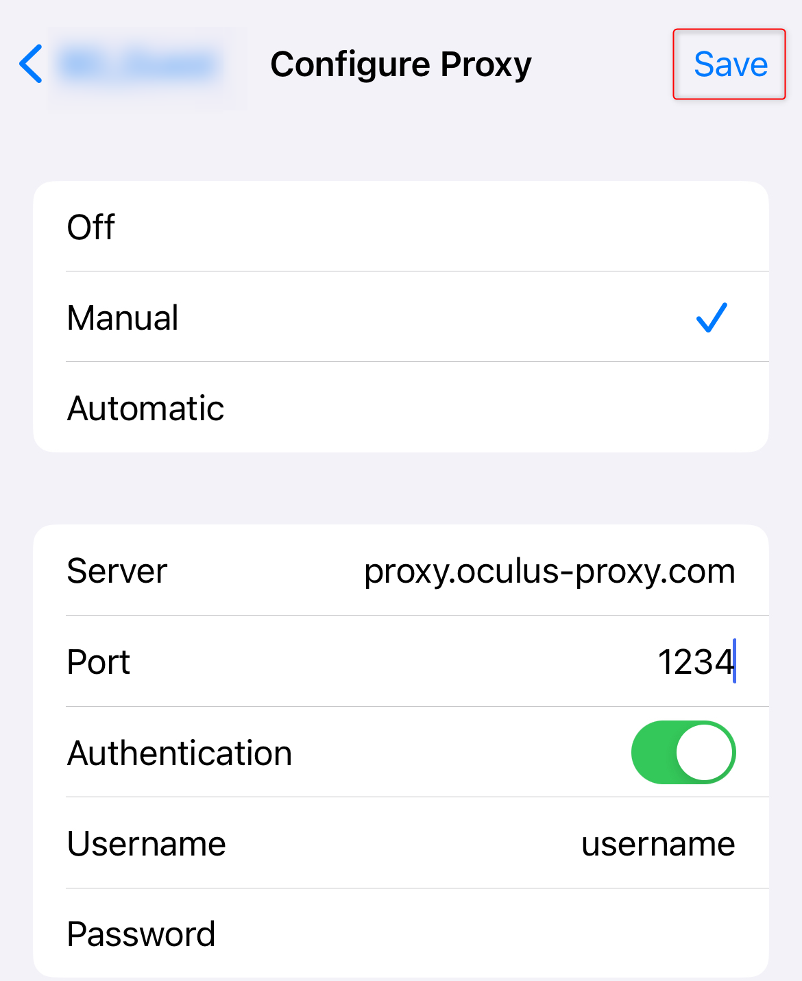 proxy.oculus-proxy.com or the Host provided in your dashboard.2. Port: Enter the Port number from your Oculus Dashboard.3. Username and Password: Add your Oculus Proxy login credentials.4. Double-check the details for accuracy and tap Save to apply the changes.