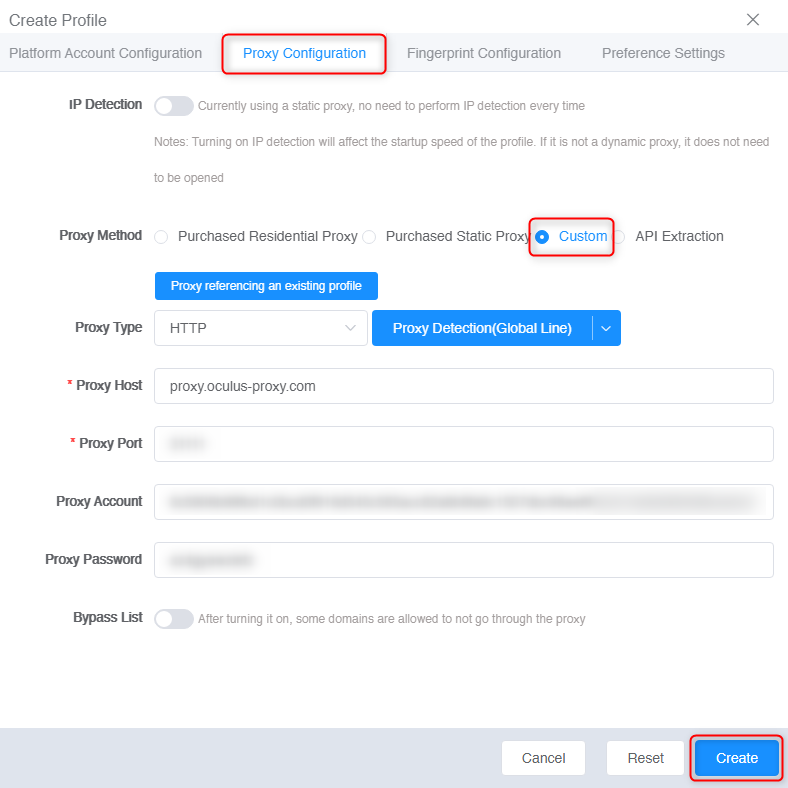 1. Switch to the Proxy Configuration tab.2. Enable the Custom option to access the proxy settings.3. Enter your Oculus Proxy credentials: