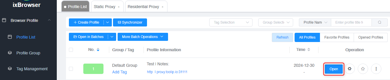 1. Return to the Profile List section.2. Locate your newly created profile.3. Click Open to start browsing with the configured Oculus Proxy settings.