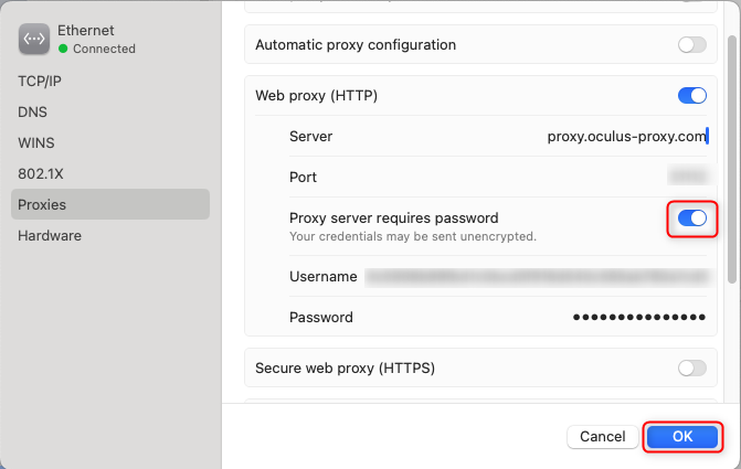 proxy.oculus-proxy.com).2. Port: Input the port number available in your Oculus Dashboard.3. Enable Authentication: Check âProxy server requires passwordâ to display the Username and Password fields.4. Username and Password: Provide your Oculus Proxy login credentials.For a region-specific proxy, append