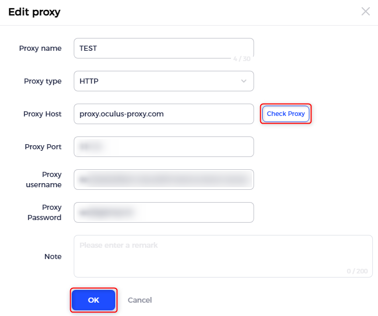 proxy.oculus-proxy.com. - Proxy Port: Enter the port number provided in your dashboard.