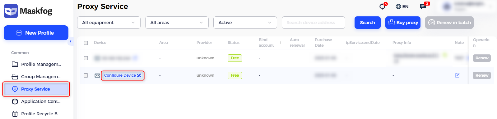 1. Open Maskfog and navigate to the Proxy Service section.2. Click Configure Device to start creating a new proxy configuration.