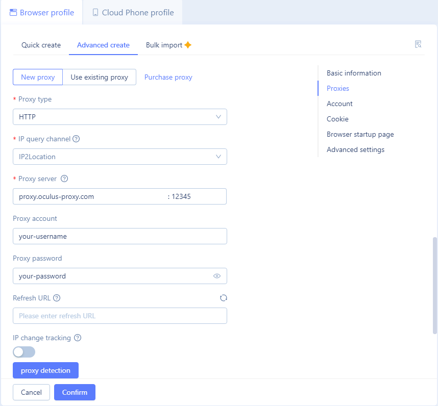 1. Scroll to the Proxies section in the profile settings.2. Enter your Oculus Proxy details as follows: