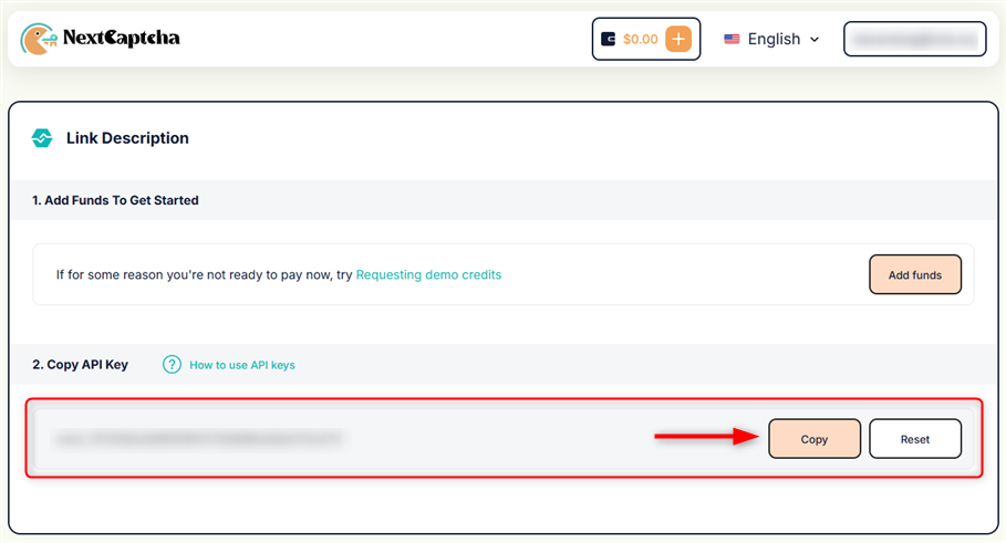 Navigate to your NextCaptcha dashboard, find your API key, and copy it.