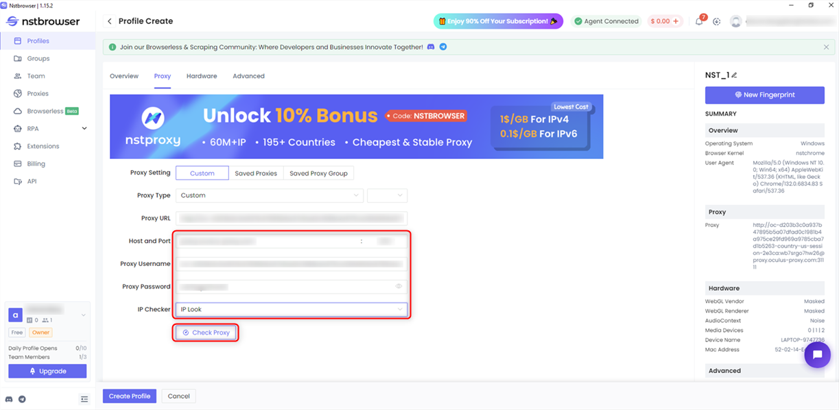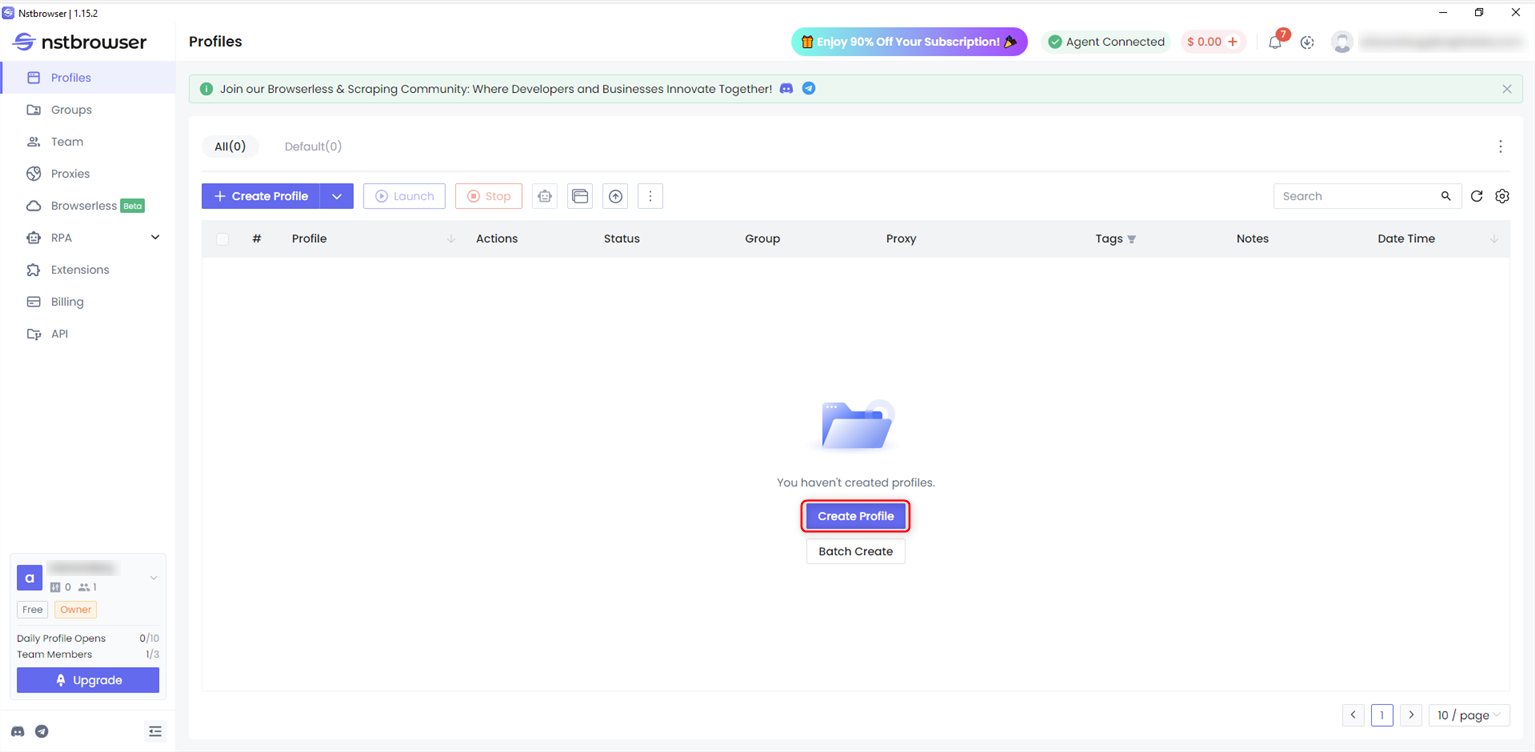Launch Nstbrowser and click Create Profile to set up a new browser instance.