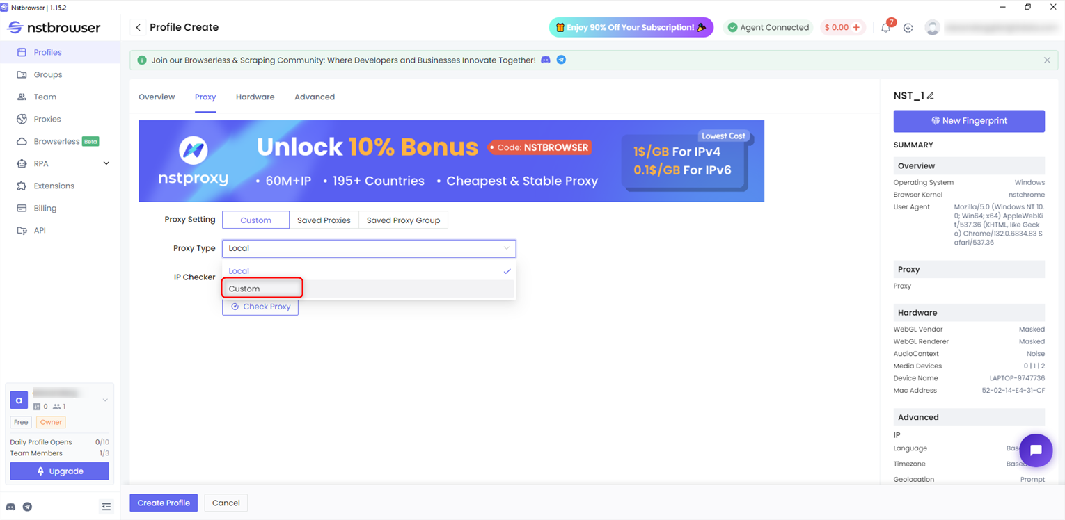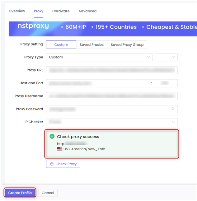 1. Navigate to the Proxy section within the profile settings.2. Select Custom as the