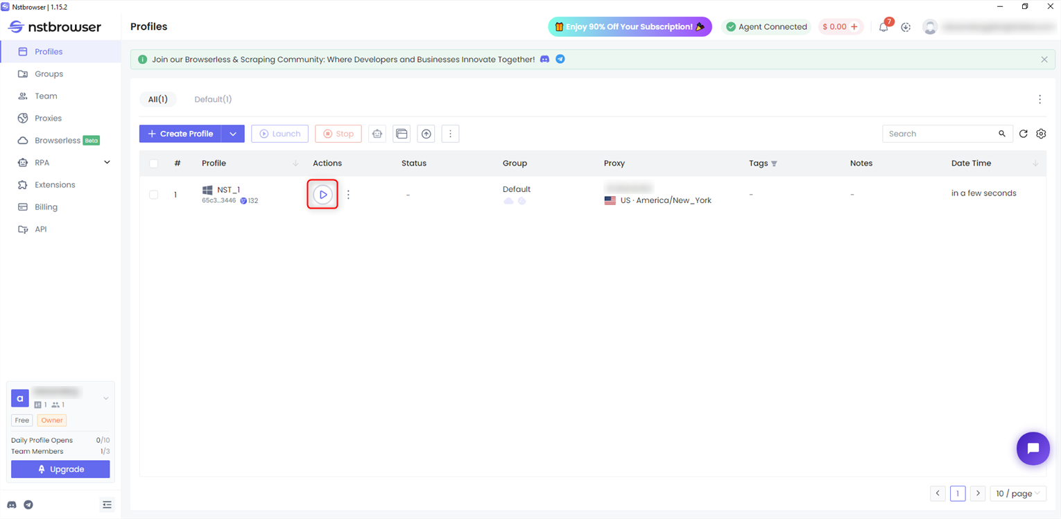 1. Locate your configured profile in Nstbrowser.2. Click the Play icon under Actions to launch the browser with your Oculus Proxy settings.