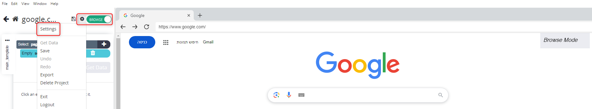 1. In your project workspace, locate the Browser setting and toggle it to On to enable advanced scraping options.2. Click the cogwheel icon in the top-left corner and select Settings to access the project configuration options.