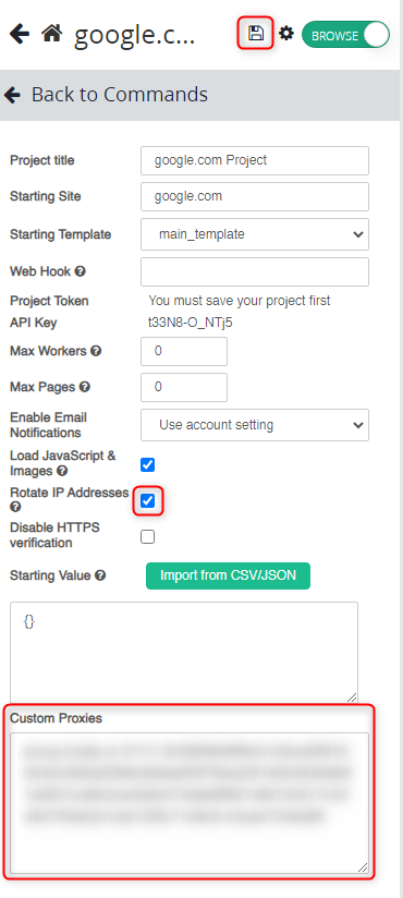 1. Enable the option Rotate IP Addresses for better anonymity.2. Log in to your Oculus Dashboard.3. Click Show Configured List under the Generic tab to copy your proxy details.4. Paste the proxy information into the Custom Proxies field in ParseHub. 5. Click Save icon to apply the settings.