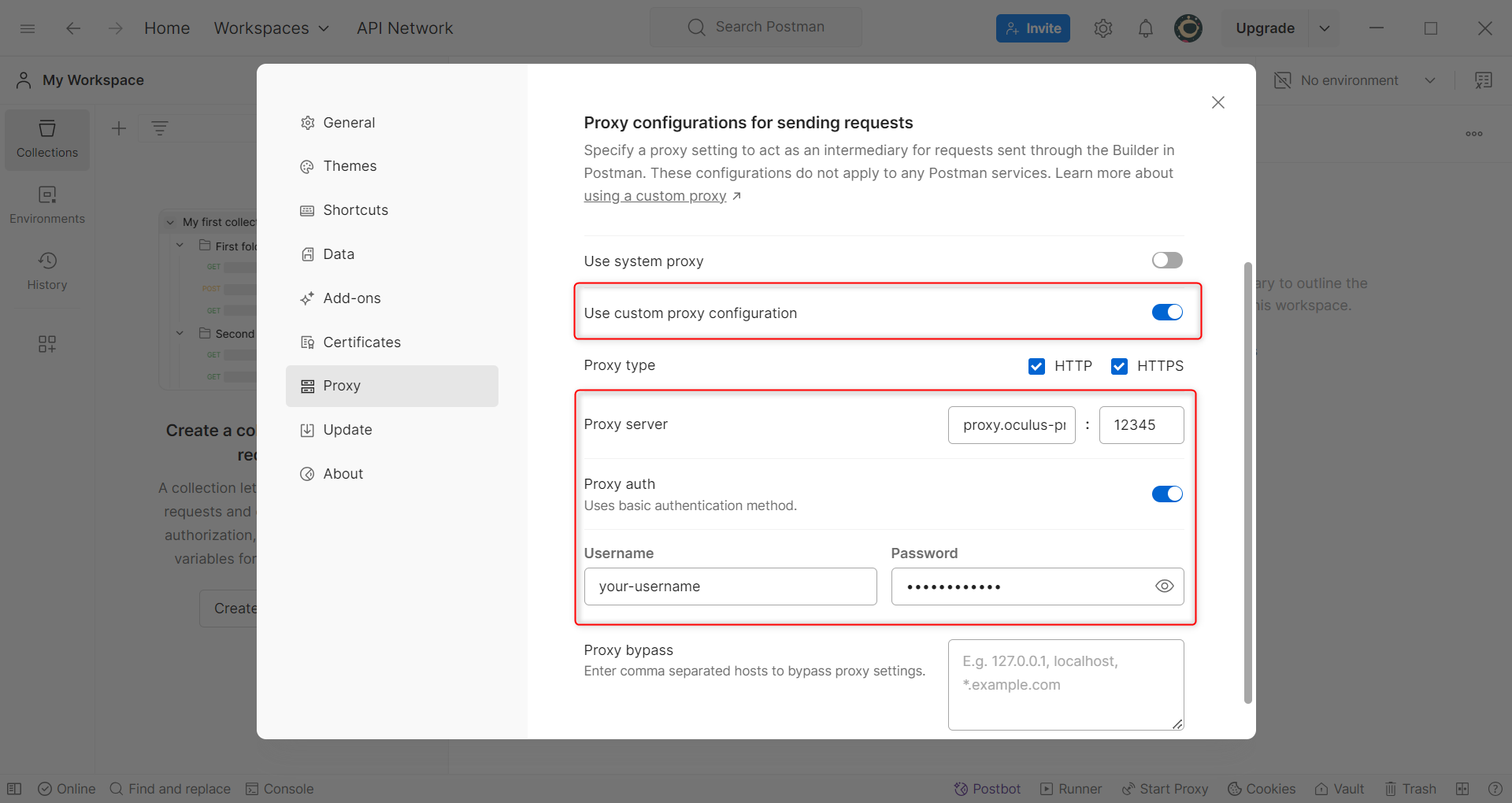 1. In the Settings menu, navigate to the Proxy tab.2. Enable Use custom proxy configuration to unlock proxy configuration options.3. Enter your Oculus Proxy details: