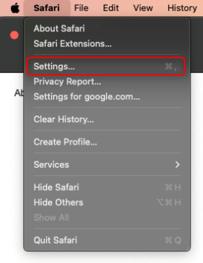 Open Safari and choose Safari from the top menu, then click on Settings (or use the shortcut ⌘,).