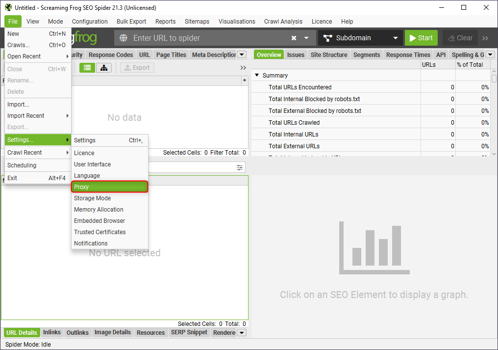 1. Open Screaming Frog and go to the File menu.2. Select Settings> Proxy to open the proxy settings window.