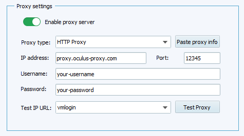 1. Enable the Proxy server toggle.2. Fill in the proxy fields using your Oculus Proxy details from the Oculus Dashboard: