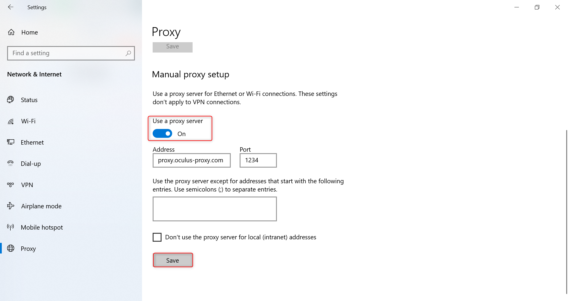 1. Scroll down to the Manual proxy setup section and toggle Use a proxy server to On.2. Fill in your Oculus Proxy details: