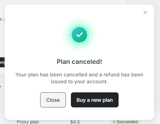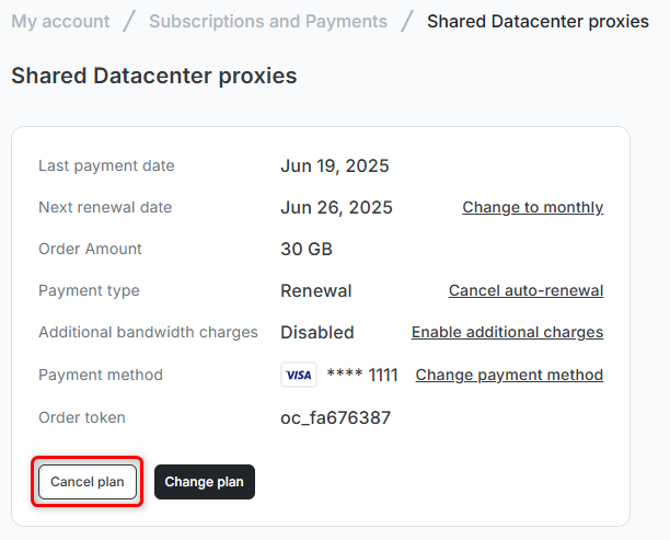 Go to the Active subscriptions page in my account on the left to view your current proxies, choose the plan you want and click Cancel plan to proceed.