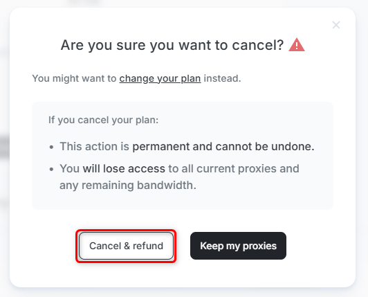 Before proceeding with cancellation, consider switching to another plan. Canceling will permanently deactivate your proxies and cannot be reversed.