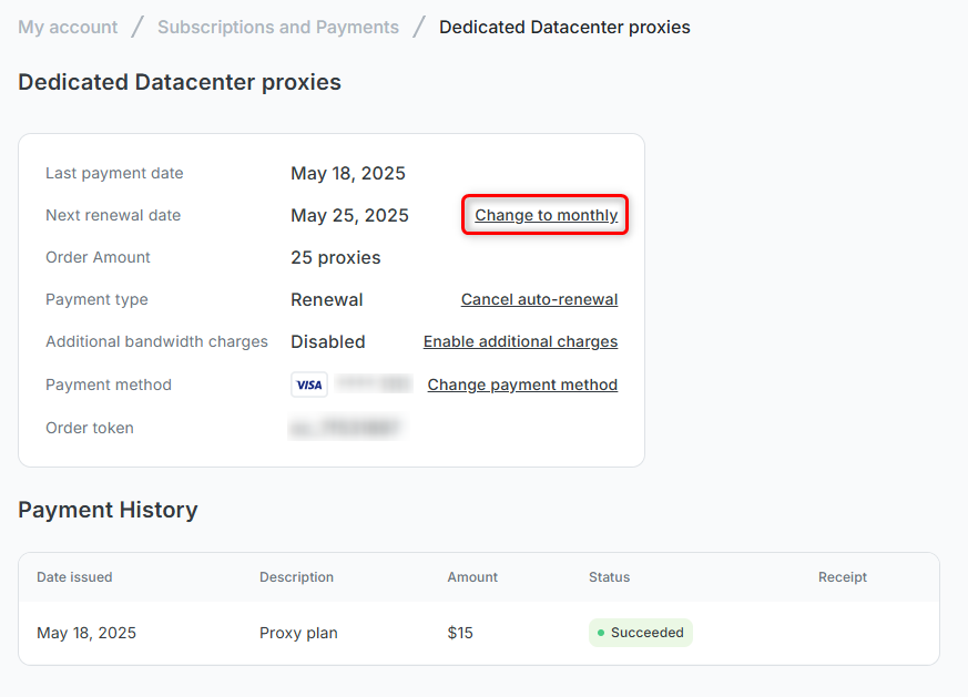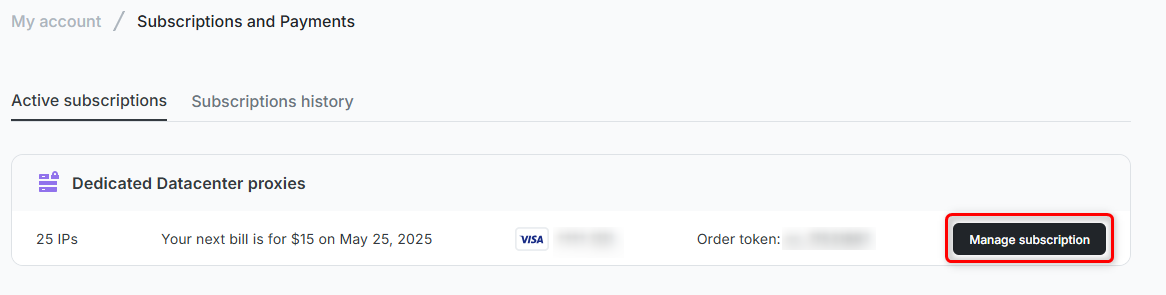 Choose the proxy you want to upgrade to a monthly subscription, and click Manage Subscription.