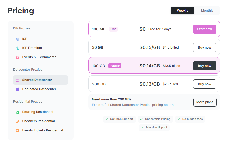 Choose your desired product from the list on the left and select a plan that fits your needs. Once decided, click Buy Now to proceed to checkout.