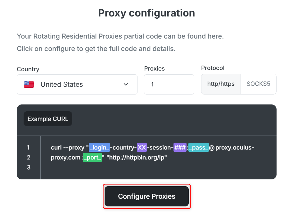 Here’s an example code to guide you. Click Configure Proxies to get your credentials.