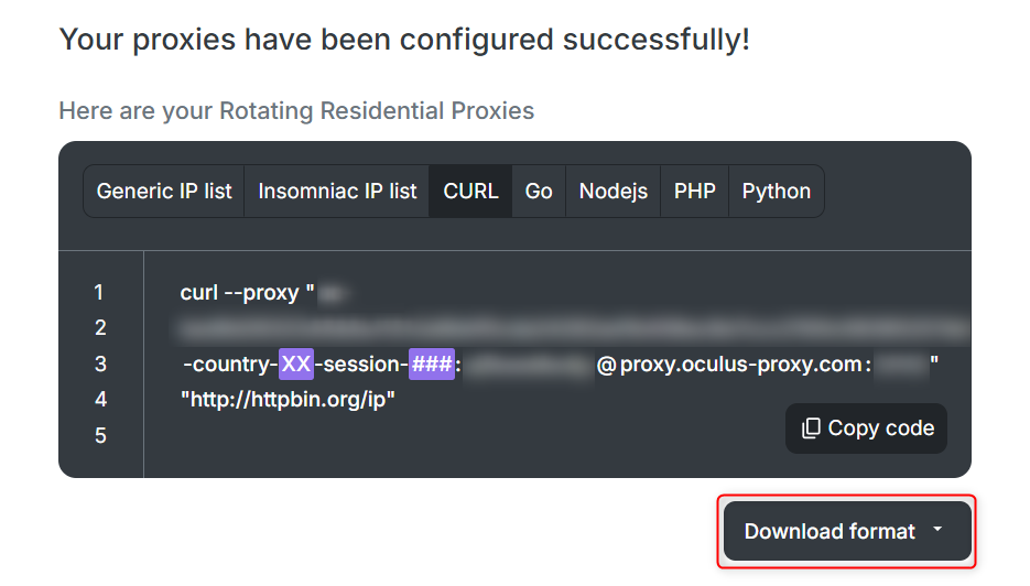 Copy the provided code to start using your proxy.This code includes everything you need: your