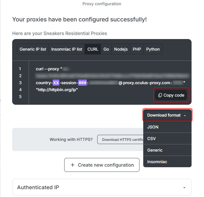 Copy the provided code to start using your proxy.This code includes everything you need: your