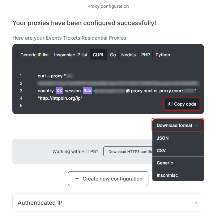 Copy the provided code to start using your proxy.This code includes everything you need: your username, password and port.
